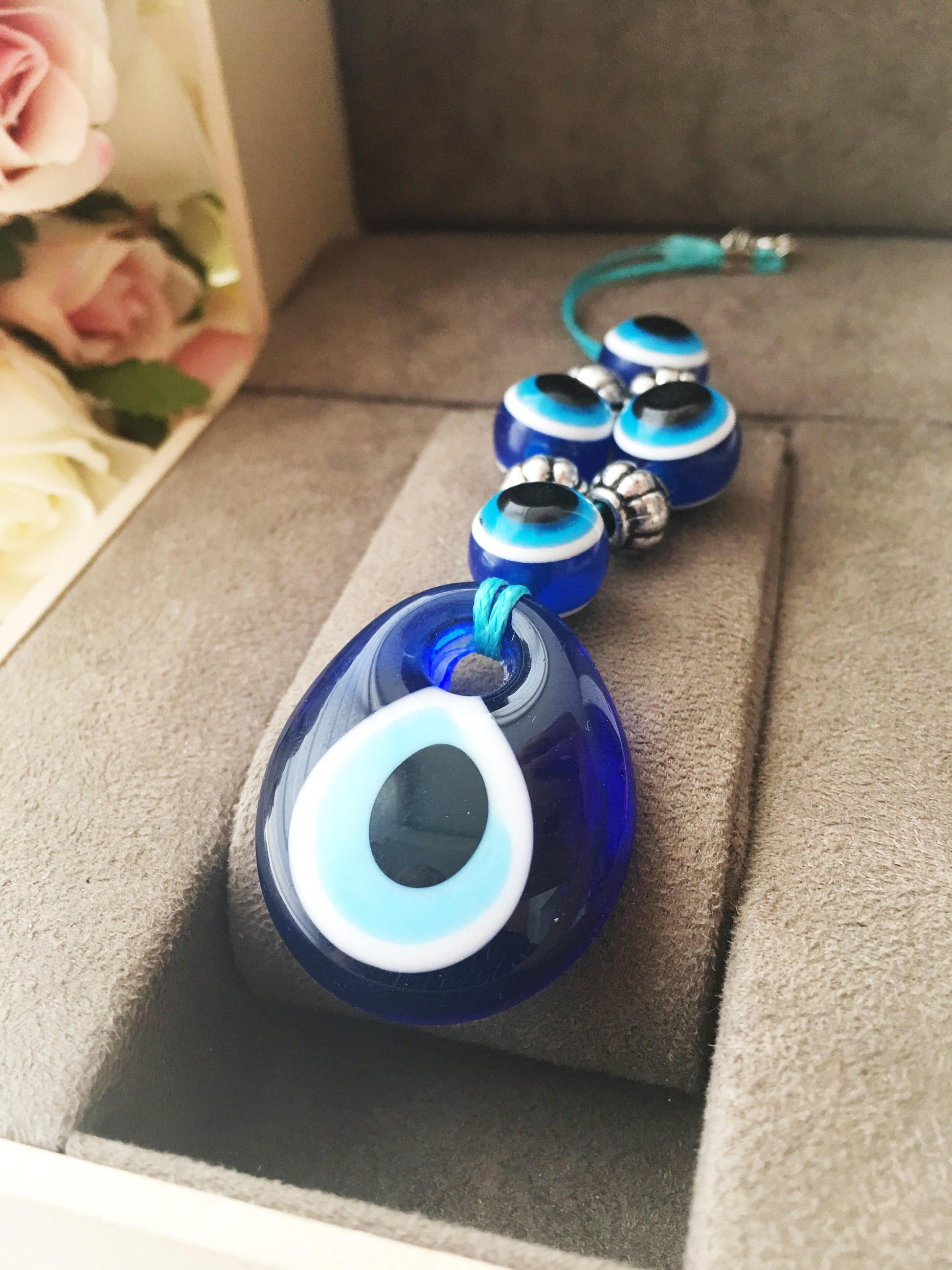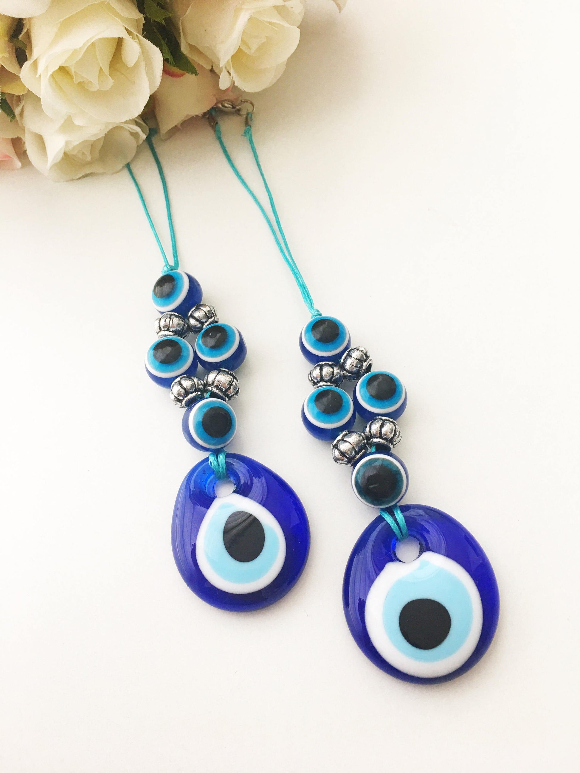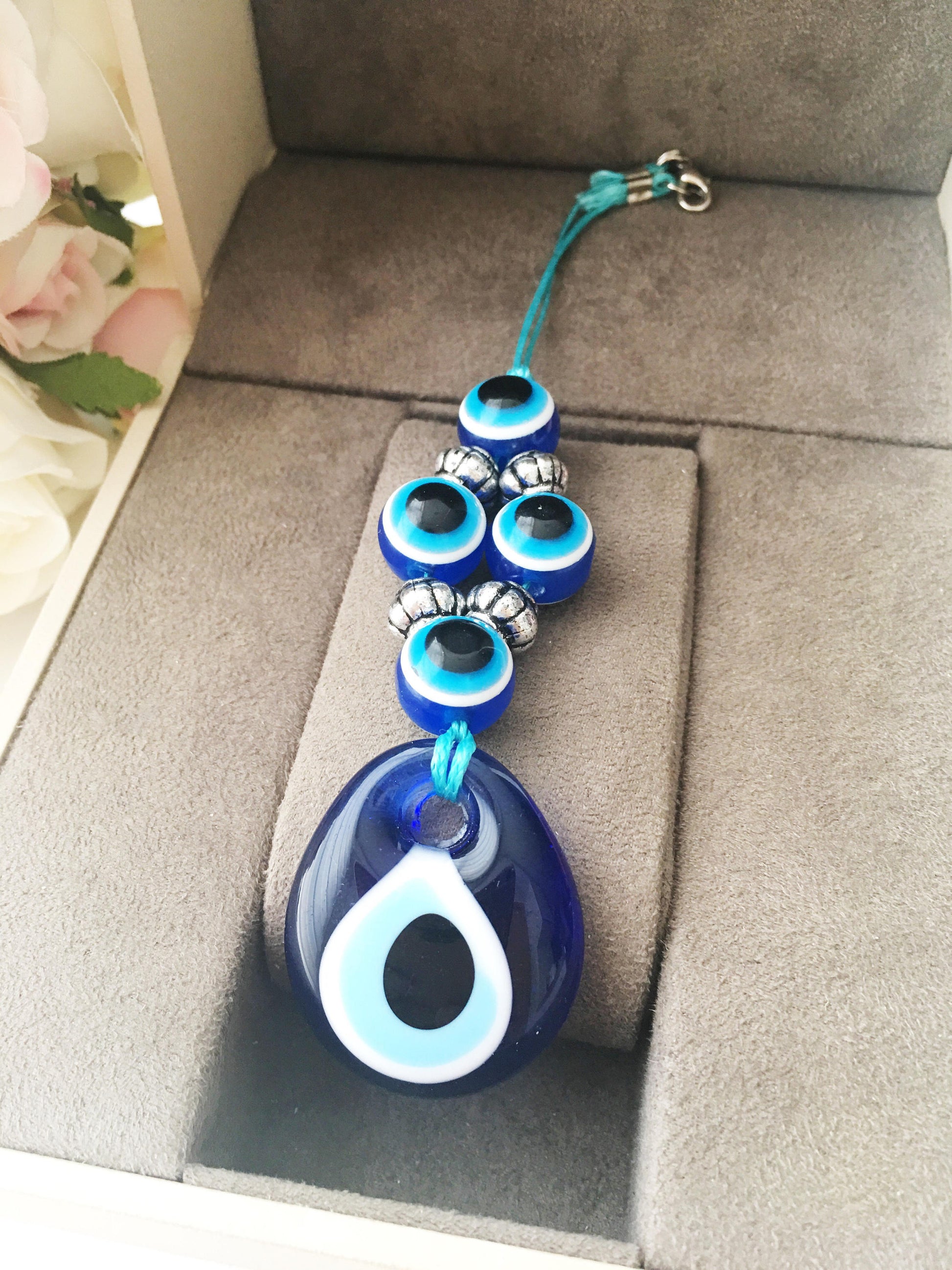 This Blue Evil Eye Rearview Mirror Charm adds protection and style to your car interior. Crafted with durable glass beads, it serves as a decorative accessory while symbolizing good luck.