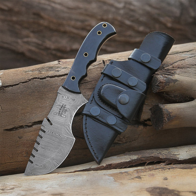 This hand-forged Damascus Hunting Knife combines sharpness, balance, and durability in a 10.5" overall design. Featuring a 6" tracker blade and a heat- and moisture-resistant bull horn handle, it’s perfect for hunting, fishing, camping, hiking, and survival. Comes with a genuine leather sheath.
